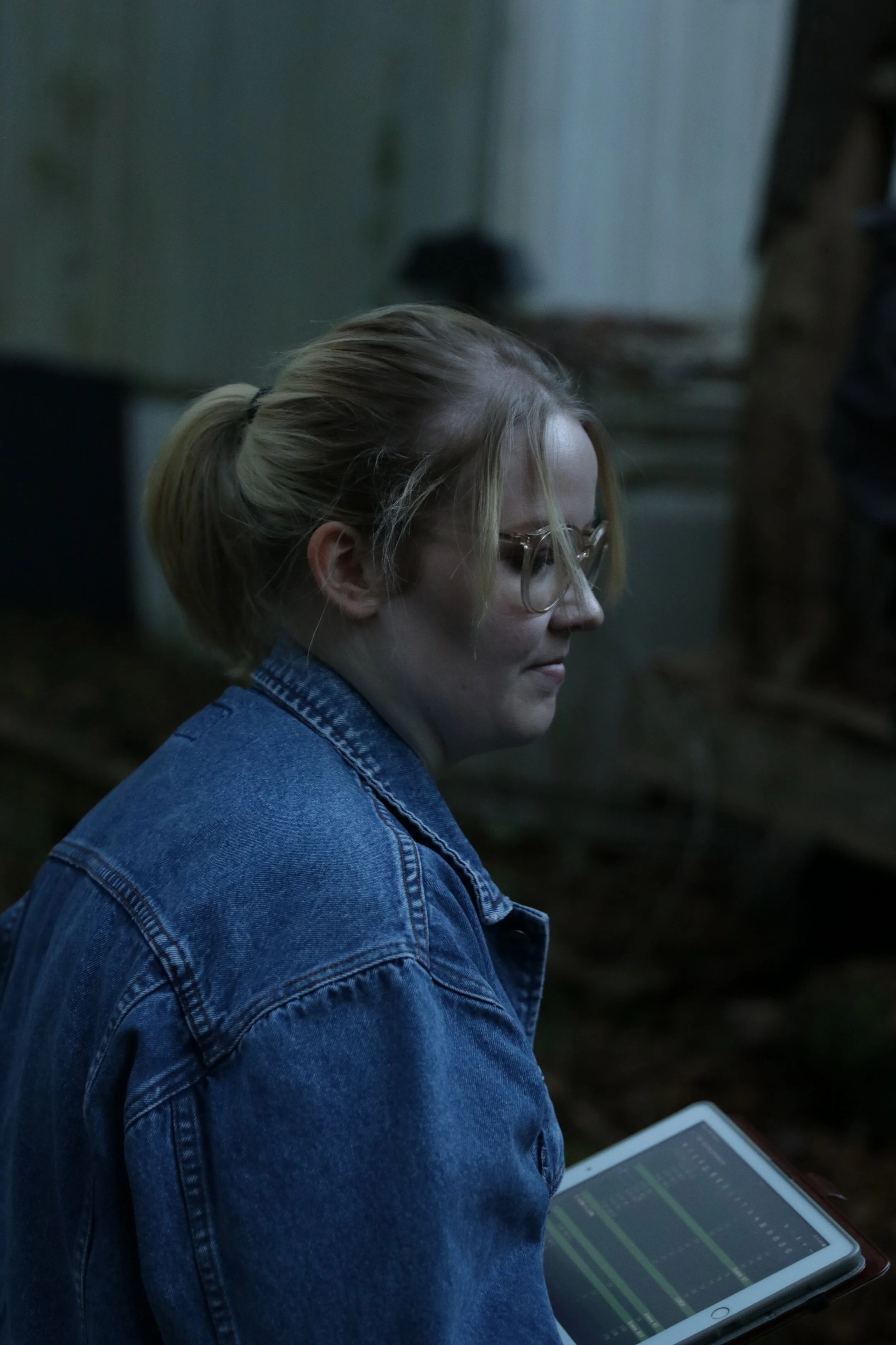 A person with blonde hair tied back, wearing glasses and a denim jacket, looks at an electronic device with a grid of green and black lines, in a dimly lit outdoor setting.