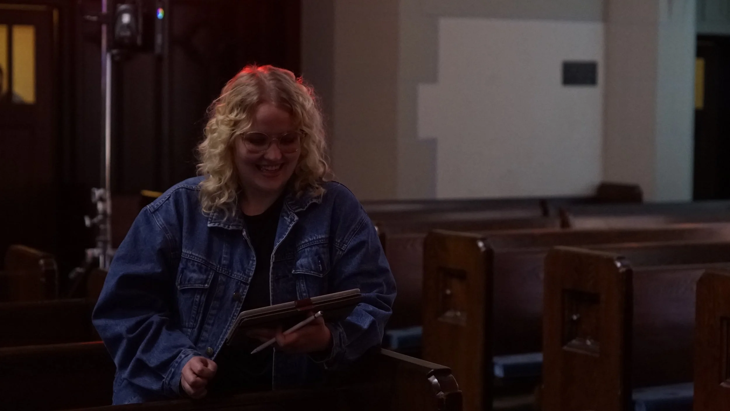 A smiling person with curly blonde hair and glasses, wearing a denim jacket, holding a notebook and pen, standing inside a church with wooden pews.