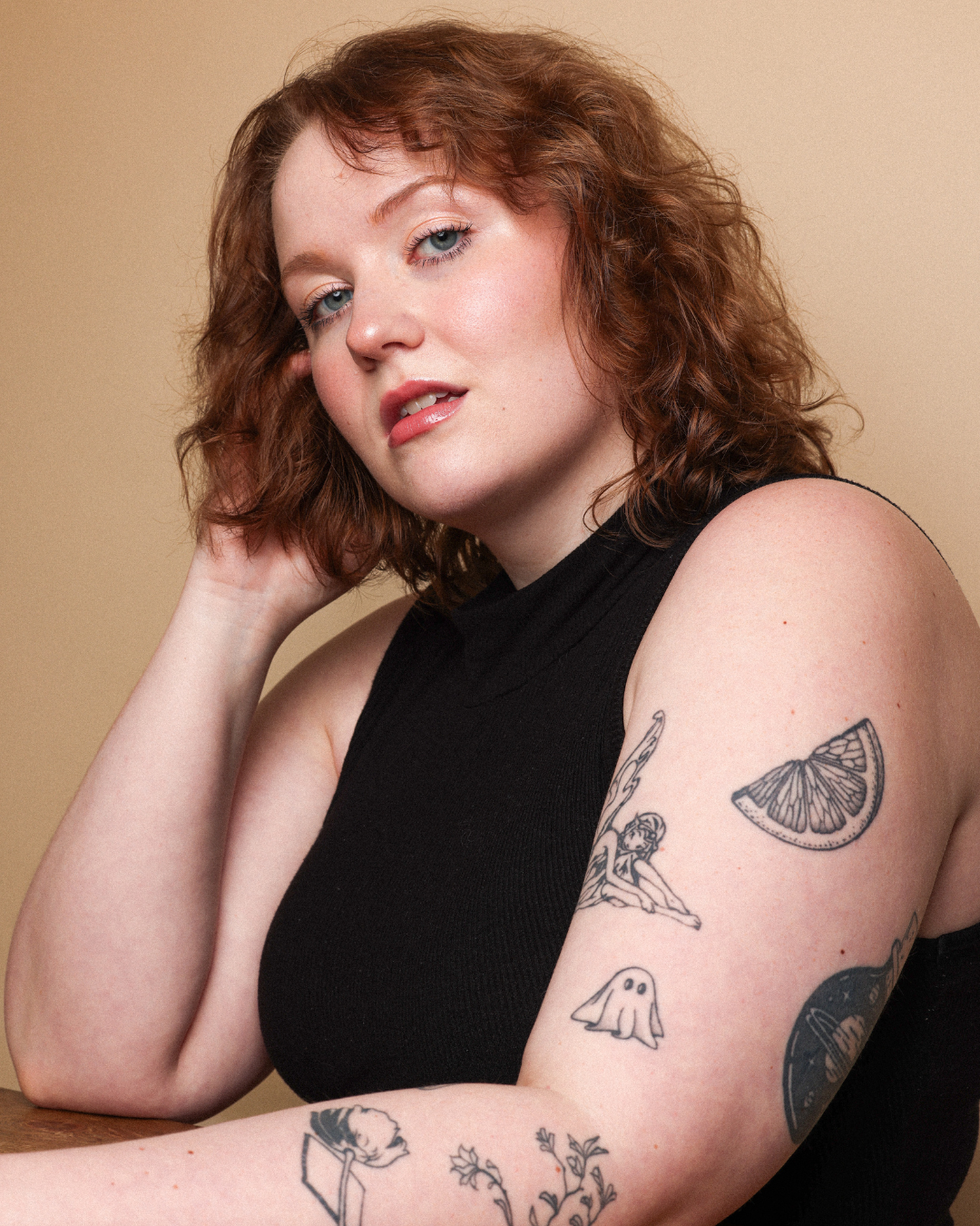 A photo of a person with curly auburn hair, wearing a black sleeveless top, resting their chin on their folded hands, smiling softly, sitting at a wooden table against a beige background. They have tattoos on their left arm.
